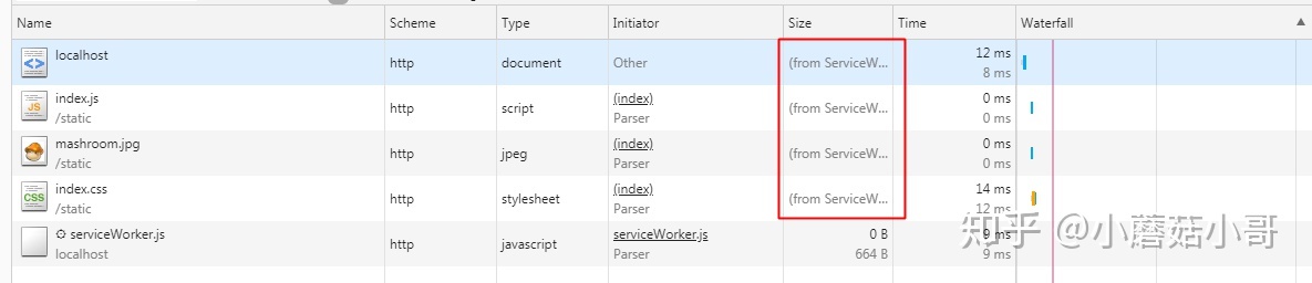我们可以在 Chrome 的开发者工具中,Network -> Size 一列看到一个请求最终的处理方式:如果是大小 (多少 K, 多少 M 等) 就表示是网络请求,否则会列出 from memory cache, from disk cache 和 from ServiceWorker。