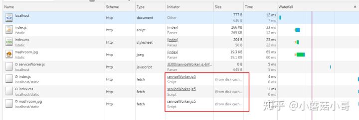 2. 第二次访问(无论关闭 TAB 重新打开,还是直接按 F5 刷新)都能看到所有的请求标记为 from SerciceWorker。