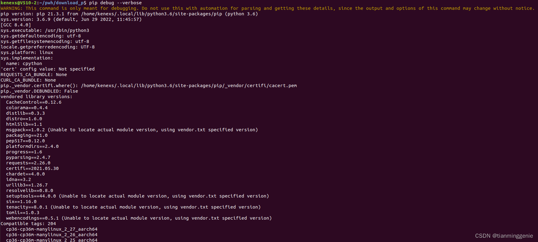 1、检查本机的python版本是否和文件上的一致, tensorrt-8.2.1.8-cp36-none-linux_x86_64.whl 名字上的-cp36-说明该文件使用python3.6才可以编译。2、如果python版本是对的,则可以使用pip debug --verbose 命令来查看本机支持的格式名称,如下图中的Compatible tags: 204下方的。安装tensorrt-8.2.1.8-cp36-none-linux_x86_64.whl。使用对应版本的python进行安装即可。