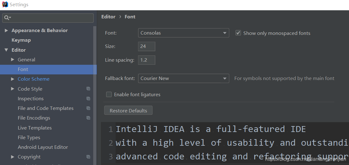 点击File——Settings——Editor——Font ,里面可以修改字体、大小、间距