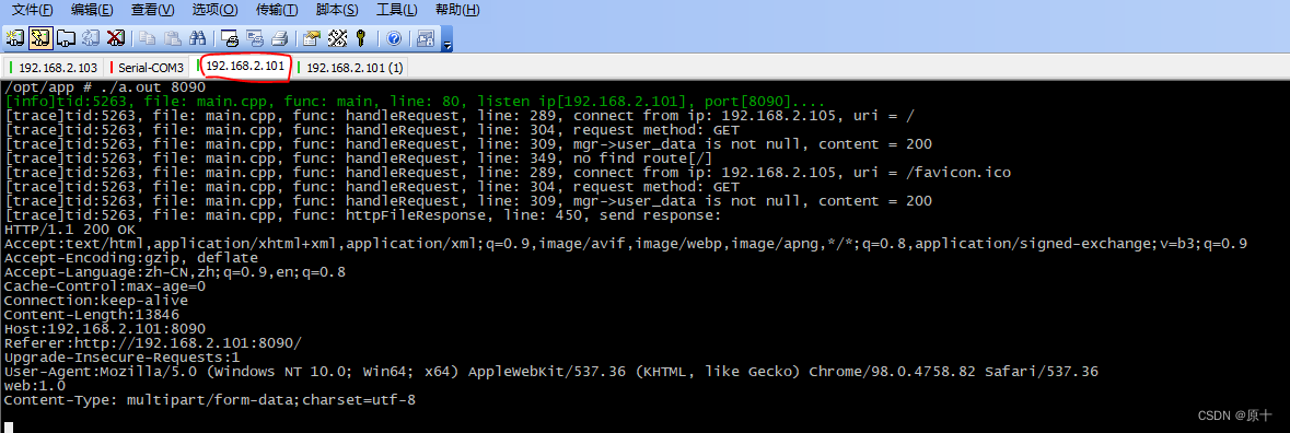 我的嵌入式设备 ip 为 192.168.2.101,这里是 ssh 连接上去的。程序运行起来后,通过浏览器进行访问,如: