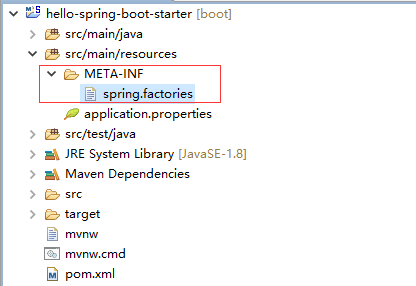 最后在src/main/resources 文件夹下新建文件夹 META-INF,在新建的META-INF文件夹下新建 spring.factories