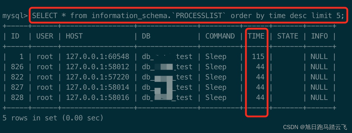 mysql> SELECT * from information_schema.`PROCESSLIST` WHERE Time > 1000 ORDER BY TIME desc;