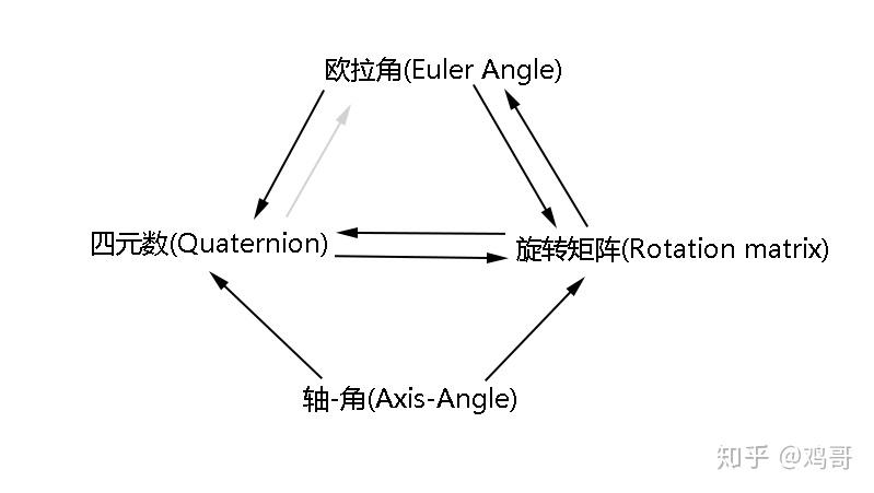 至于这几种三维旋转的表示形式随手百度Google都可以看到很多科普文的,这里着重说一下他们之间的转换的细节吧(不少公式和推导,预警一波,如果有错误请指出~)