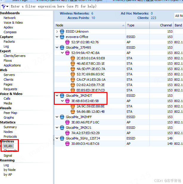选择Wireless WLAN选项,选择需要关注的热点AP和STA,比如我们关注的是3MZHDT这个热点,找到这个热点对应的mac地址:3E:6B:83:E2:6E:5B