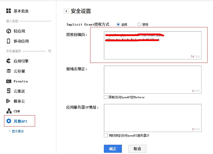 在应用管理-》OAuth安全设置-》授权回调页 中填写以下地址: