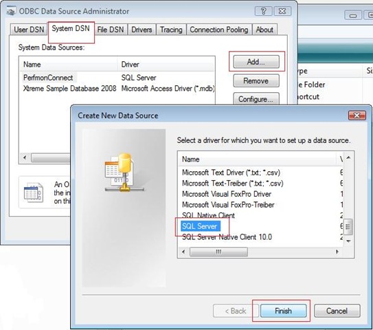 控制面板->管理工具->Data Sources (ODBC)->选择系统DNS->新增Sql Server->完成。如下图: