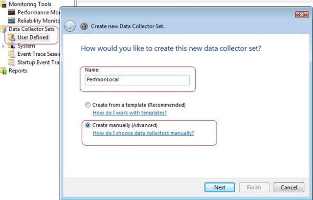 在图1的界面中,展开数据收集(Data Collector Sets)->右击用户定义(User Defined)->新建->数据集合->选择手动创造,如下图: