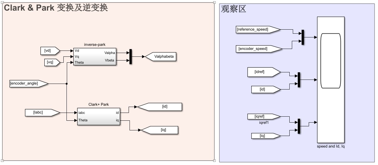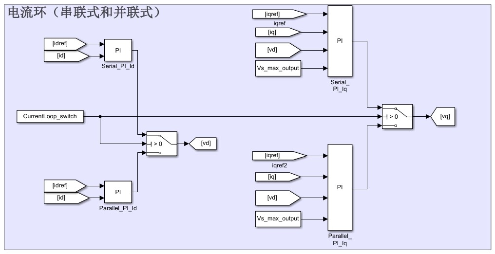 包括dq轴电流设定值产生模块,控制方式自适应内嵌式电机(MTPA)和表贴式电机(Id =0)。通过不同的控制方式,可以有效应对不同的电机运行工况,提高系统的适应性和灵活性。