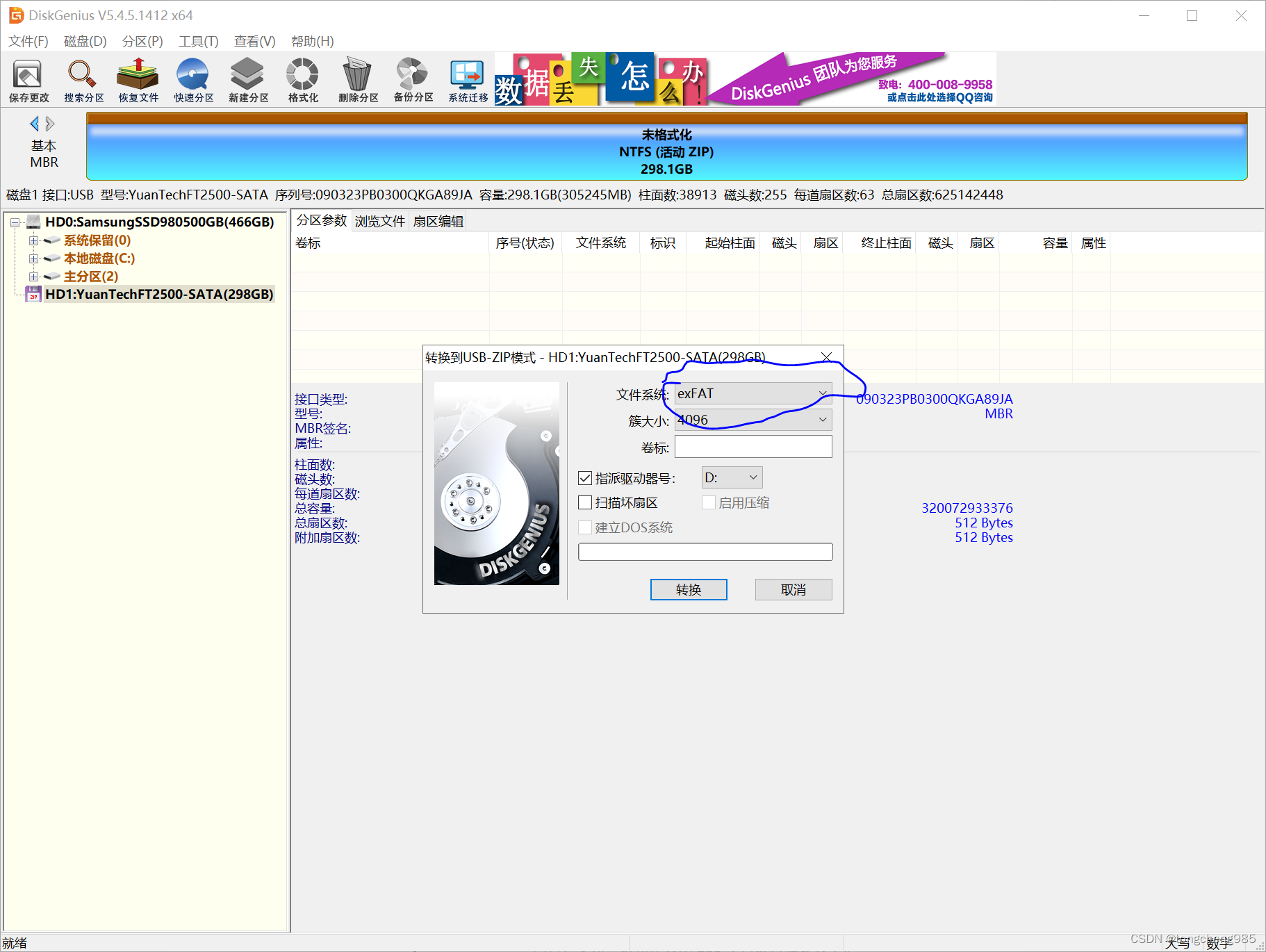 运行好了之后,插入自己的移动硬盘,右键,选择转换启动模式,选择转换为usbzip启动模式,然后把格式选为exfat