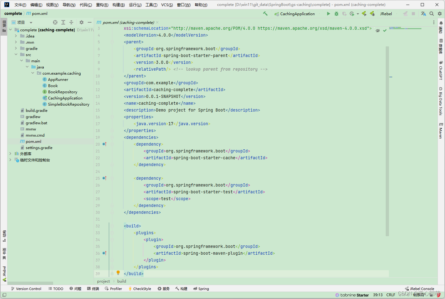 1.源码克隆:git clone https://github.com/spring-guides/gs-caching.git 2.包含两个项目initial和complete,initial可以根据文档练习完善,complete是完整项目 3.功能描述:构建应用程序,在图书存储库上启用缓存,获取同一本书的第二次和后续时间要快得多