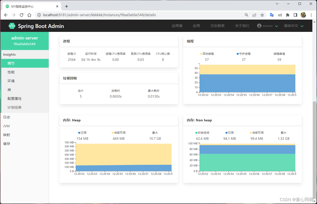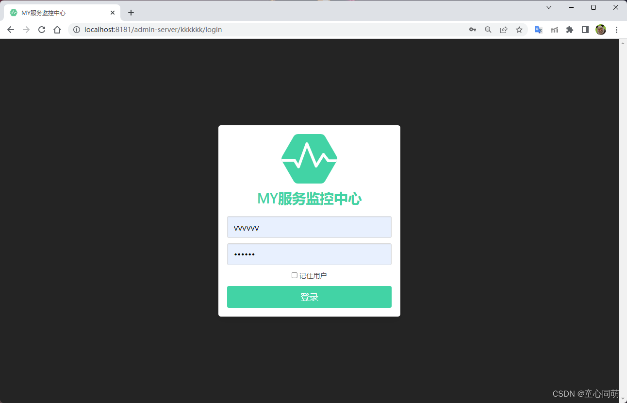 1.项目访问地址:http://localhost:8181/admin-server server: port: 8181 servlet: context-path: /admin-server 2.监控中心该项目的服务名称:admin-server spring: application: name: admin-server 3.监控中心访问地址:http://localhost:8181/admin-server/kkkkkk (用户名:vvvvvv 密码:123456) spring: security: user: name: vvvvvv password: 123456 boot: admin: ui: title: MY服务监控中心 context-path: /kkkkkk 4.将监控中心自身服务添加到监控中心 --- # Actuator 监控端点的配置项 management: endpoints: web: exposure: include: '*' endpoint: health: show-details: ALWAYS logfile: external-file: ./logs/admin-server.log --- # 监控配置 spring.boot.admin.client: # 增加客户端开关 enabled: true # 设置 Spring Boot Admin Server 地址 url: http://127.0.0.1:8181/admin-server/kkkkkk # 监控中心访问地址 instance: service-url: http://127.0.0.1:8181/admin-server # 项目访问地址 username: vvvvvv password: 123456 - 监控配置
