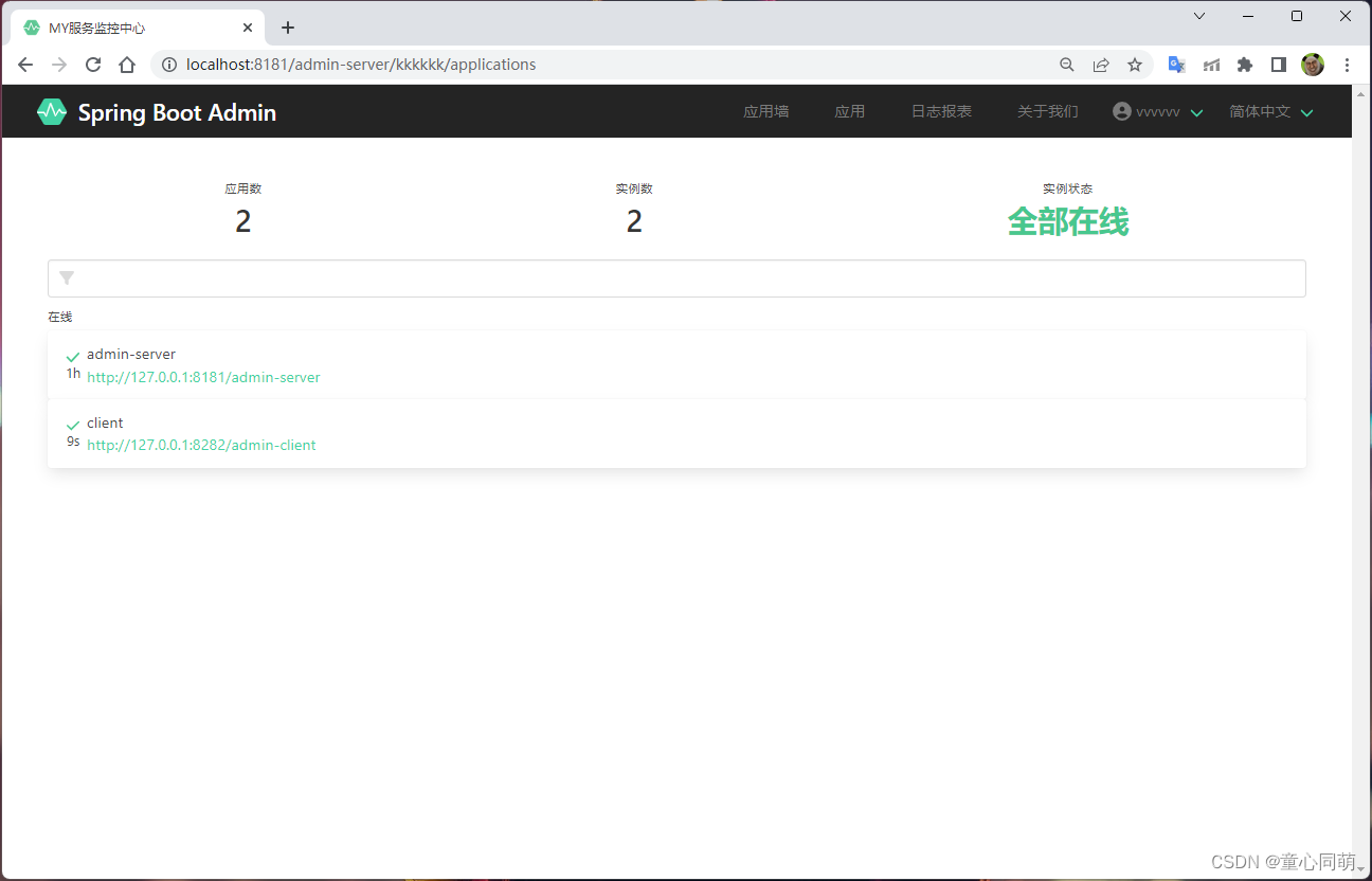 1.pom.xml <!-- https://mvnrepository.com/artifact/de.codecentric/spring-boot-admin-starter-client --> <dependency> <groupId>de.codecentric</groupId> <artifactId>spring-boot-admin-starter-client</artifactId> <version>2.7.7</version> </dependency> 2.application.yml server: port: 8282 servlet: context-path: /admin-client spring: application: name: admin-client --- # Actuator 监控端点的配置项 management: endpoints: web: exposure: include: '*' endpoint: health: show-details: ALWAYS logfile: external-file: ./logs/admin-client.log --- # 监控配置 spring.boot.admin.client: # 增加客户端开关 enabled: true # 设置 Spring Boot Admin Server 地址 url: http://127.0.0.1:8181/admin-server/kkkkkk instance: service-url: http://127.0.0.1:8282/admin-client name: client username: vvvvvv password: 123456