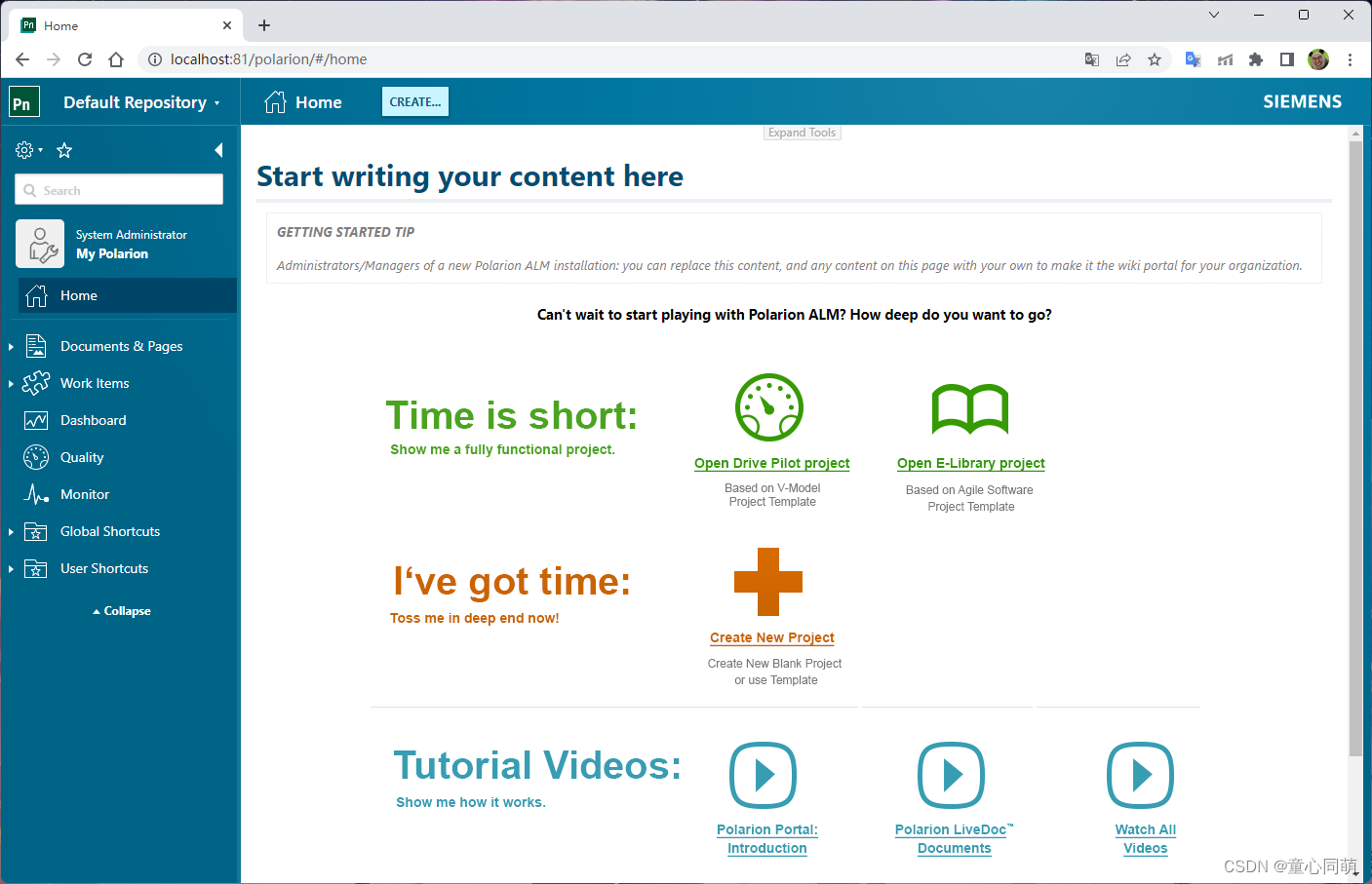 注意:访问试用之前需要先配置polarion.properties(否则无法远程访问) E:\programs\Polarion_2304\polarion\configuration\polarion.properties base.url=http://本机IP地址:81 repo=http://本机IP地址:81/repo/