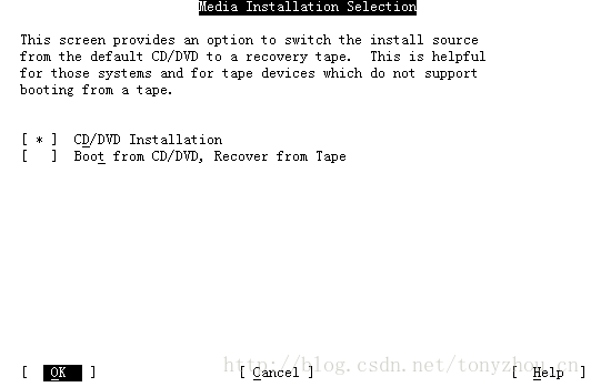 8、根据需要选择从CDROM/DVD还是磁带安装,选择完成后选OK回车