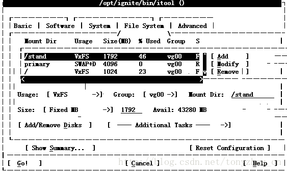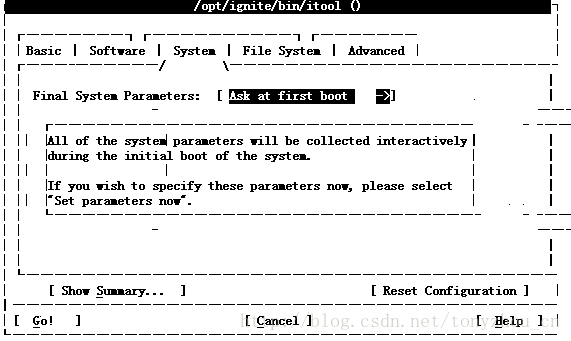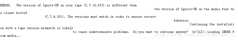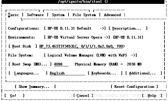 如果磁带备份时所用的ignite版本和安装光盘上的ignite版本不同,则会提示磁带上的ignite版本和光盘上的不同,恢复可能的问题,先Y继续,选N就中断,选Y继续进行,开始从磁带进行恢复过程,检查ignite文件时因版本不同,有些文件会报找不到,则恢复失败,需要找相同版本的ignite进行引导恢复;如果版本相同则直接进入配置界面,配置文件系统和主机名等后选OK,进入下面界面: