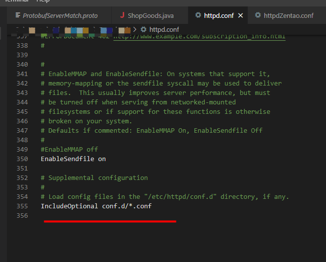 一般 Apache的 /etc/httpd/conf/httpd.conf 文件最后一行 ,IncludeOptional 后默认是引入 conf.d目录下的所有.conf文件,如果能搜到这一行 则不用改动,如果搜不到,就追加这一行代码 并保存:IncludeOptional对应的值为 /etc/httpd/conf.d/*.conf ,如果值不同,则以文件内的值为准