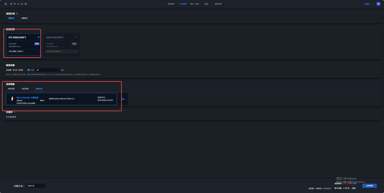 2、选择好所在区域、所需配置、计费方式后在镜像市场搜索Flux.1 Kontext Dev镜像
