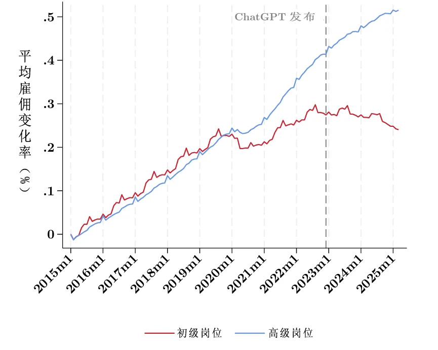 哈佛大学近期研究(Seyed M. Hosseini & Guy Lichtinger, 2025)基于Revelio Labs和LinkedIn的数据集,涵盖28.5万家企业、6200万雇员,发现了一个明显趋势:自2022年ChatGPT发布后,企业招聘初级岗位的规模显著收缩,初级与高级岗位就业人数逐渐形成“剪刀差”。