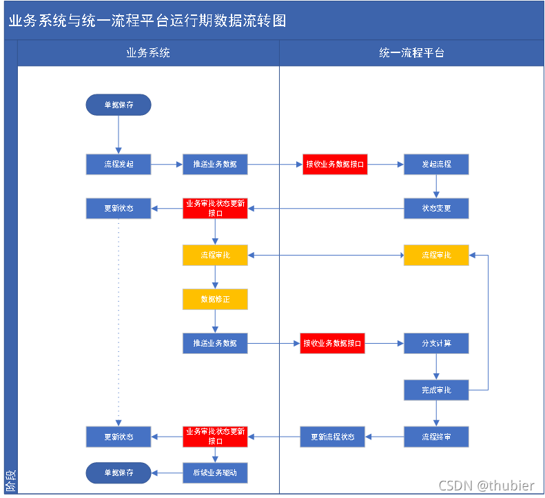 在运行期,业务数据的调整由业务体系完,流程流转动作由统一流程平台完成,而统一流程平台的流转条件需要业务数据支撑。流程结束后需要通知业务系统让相应的业务数据状态进行更新,并驱动后续业务流转。