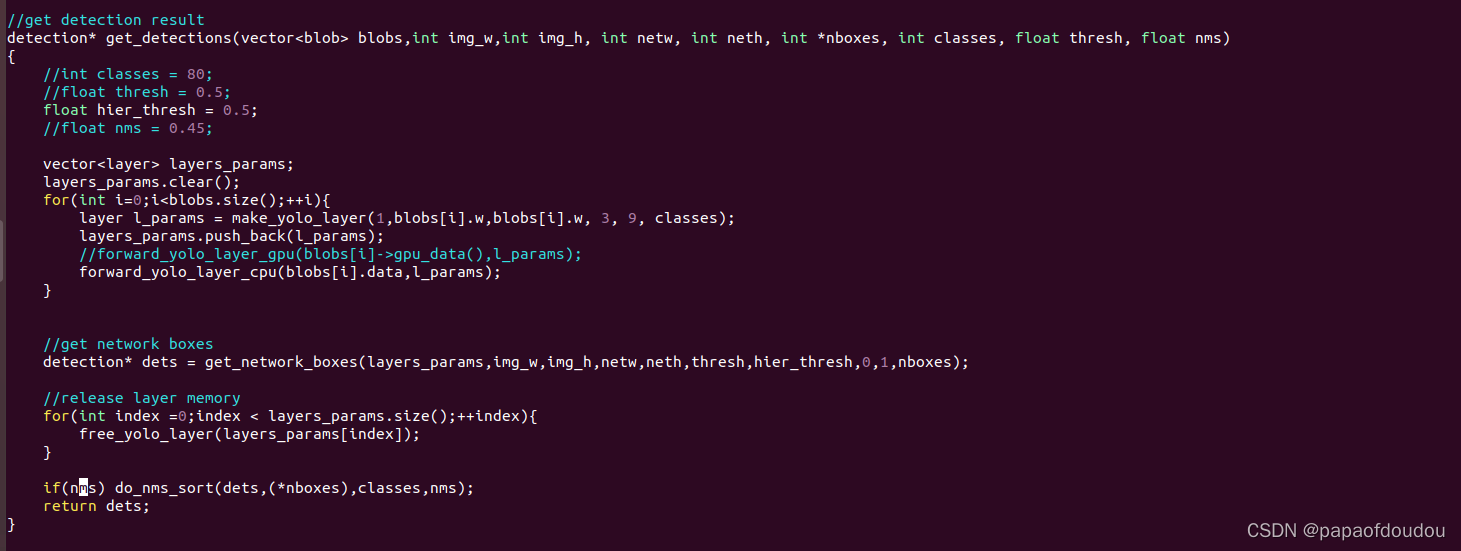 如上的改动运行了个把小时,调试发现,绝大部分时间都运行在NMS处理的过程中,出框太多了,在NMS门限不为0的情况下,需要调用NMS算法去重,大部分时间都消耗在去重上。