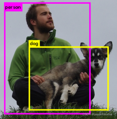值得注意的是,nms sort判断目标同一的前提是必须是同一类物体的IOU大于阈值,不同同类的物体,即便阈值很大,也不会被抑制,比如下图,一眼就可以看出,狗和人的范围几乎相同,但是两个框还是都化了出来,因为人和狗是两类物体。