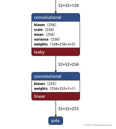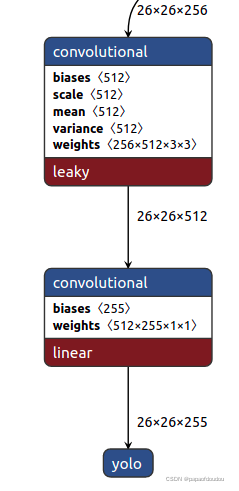 首先看YOLO1,输出前它没有经过全连接层,而是直接卷积层输出,并且最后一层是1X1卷积,目的是进行通道合并,因为有255个卷积核,将前级的1024个通道变为输出的255个输出通道。