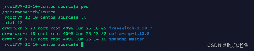 (1)将freeswitch、sofia-sip、spandsp三个模块的源码包解压到/app/package/source/目录下,如下所示: