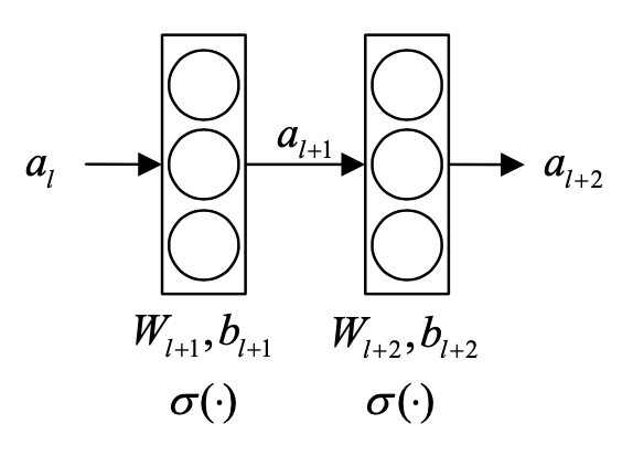 a l + 1 = σ ( W l + 1 a + b l + 1 ) a l + 2 = σ ( W l + 2 a l + 1 + b l + 2 ) a_{l+1}=\sigma(W_{l+1}a + b_l+1) \\ a_{l+2}=\sigma(W_{l+2}a_{l+1}+b_{l+2}) al+1=σ(Wl+1a+bl+1)al+2=σ(Wl+2al+1+bl+2)