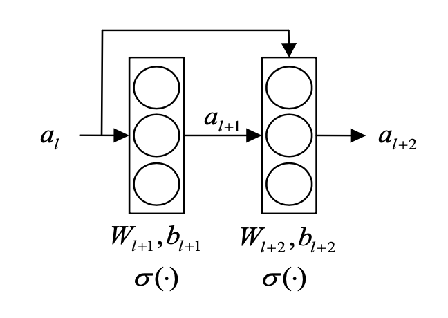 a l + 1 = σ ( W l + 1 a l + b l + 1 ) a l + 2 = σ ( W l + 2 a l + 1 + b l + 2 + a l ) a_{l+1}=\sigma(W_{l+1}a_l+b_{l+1})\\ a_{l+2}=\sigma(W_{l+2}a_{l+1}+b_{l+2}+a_l) al+1=σ(Wl+1al+bl+1)al+2=σ(Wl+2al+1+bl+2+al)