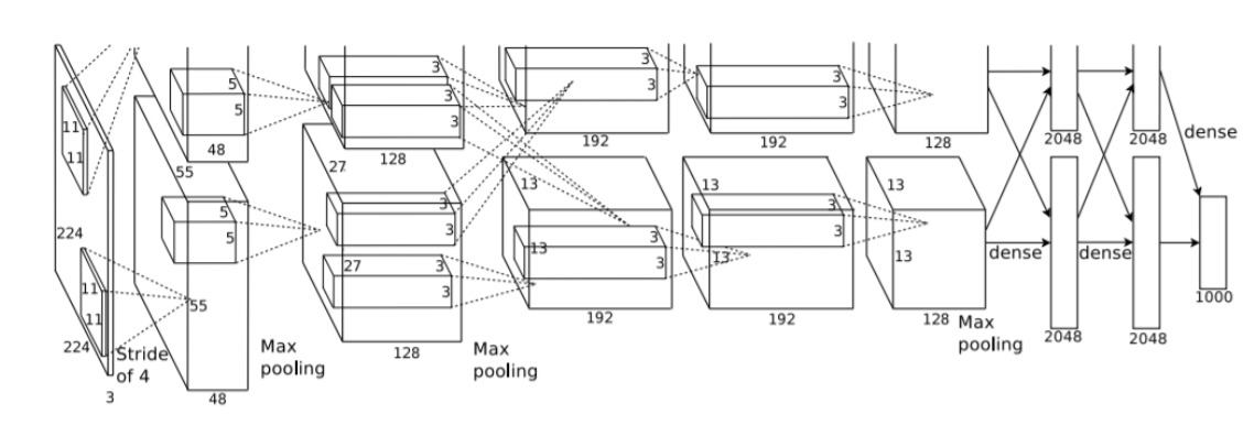 第一层(卷积层):包含96个大小为11×11的卷积核,卷积步长为4,因此第一层输出大小为55×55×96;然后构建一个核大小为3×3、步长为2的最大池化层进行数据降采样,进而输出大小为27×27×96