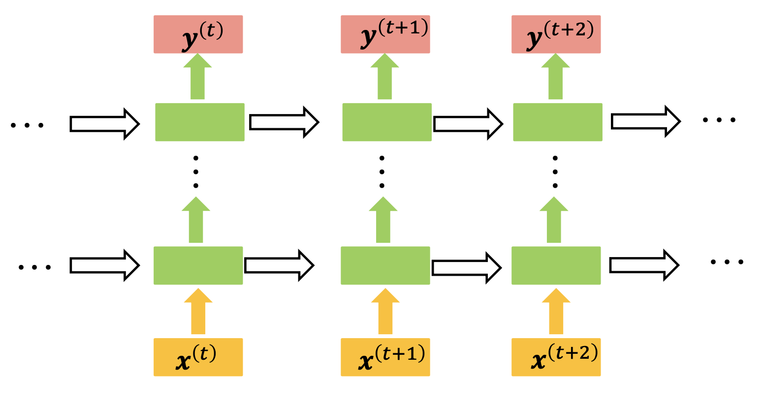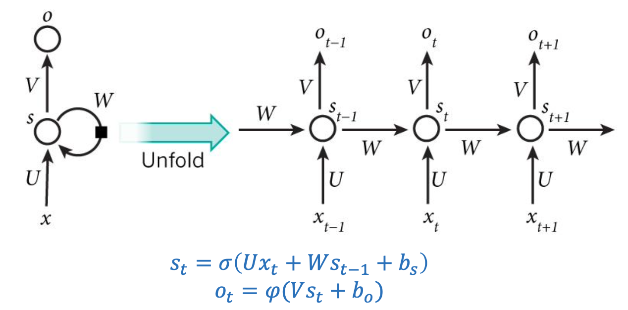 s_t=tanh(Ux_t+Ws_{t-1}) \\ \widehat{y}=softmax(Vs_t)