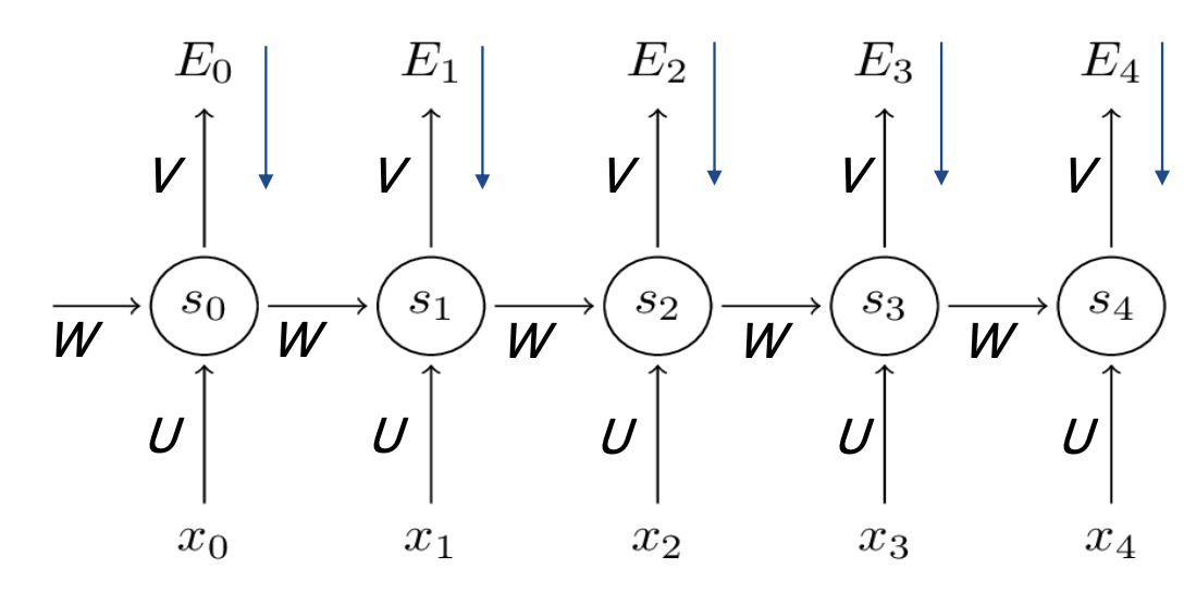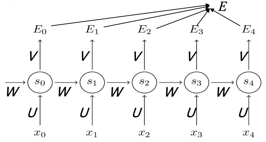 \frac{\partial E}{\partial V}=\sum_t\frac{\partial E_t}{\partial V} \\ \frac{\partial E}{\partial U}=\sum_t\frac{\partial E_t}{\partial U} \\ \frac{\partial E}{\partial W}=\sum_t\frac{\partial E_t}{\partial W}