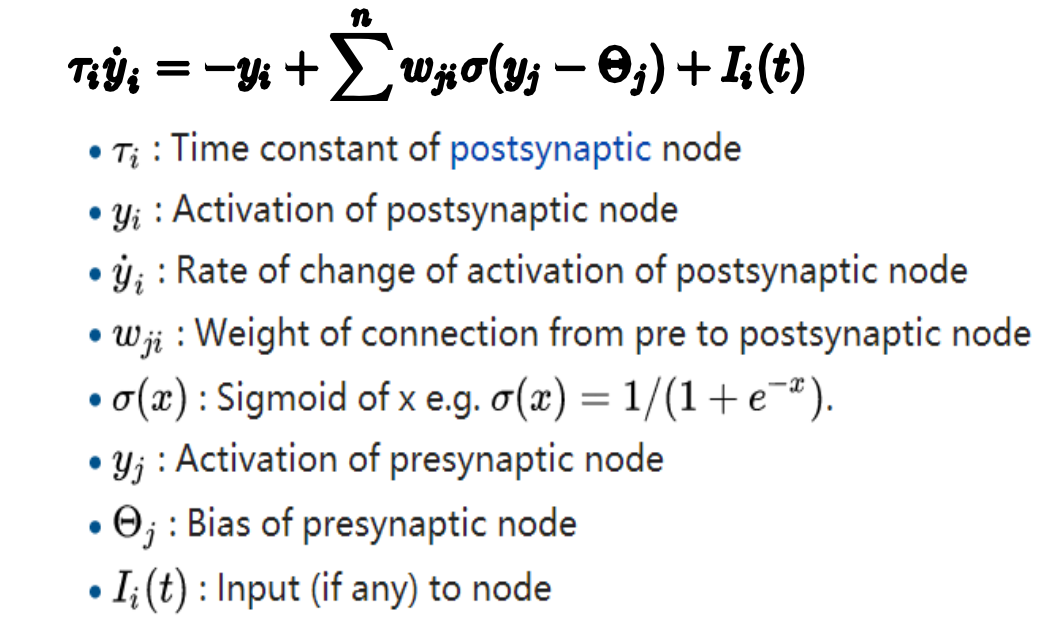 CTRNN利用常微分方程系统对输入脉冲序列神经元的影响 进行建模。CTRNN被应用到进化机器人中,用于解决视觉、协作和最 小认知行为等问题。