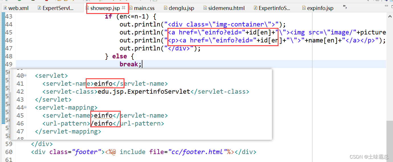 这里的einfo一定要与的showexp.jsp中的保持相同,这样点击图片或者文字才能成功跳转,并且einfo与数据库中的info还不能同名,否则会出现问题: