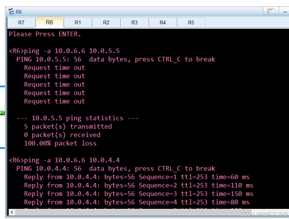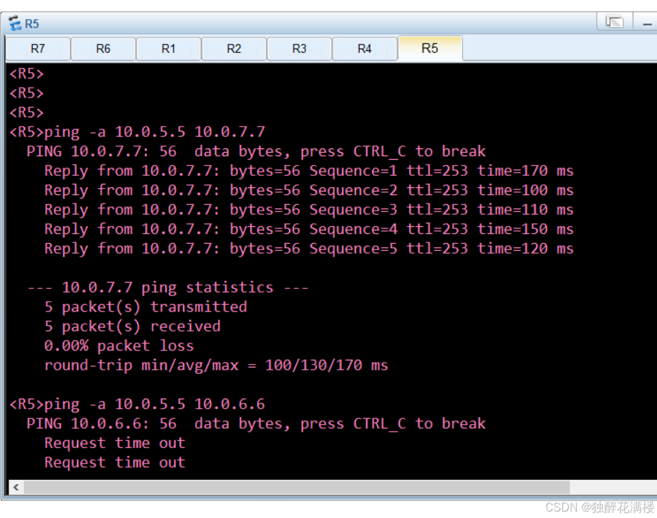 可以看到,R7仅能够与同属公司B 的10.0.5.5/32进行通信,而不能与属于公司A的10.0.4.4/32和10.0.6.6/32进行通信。