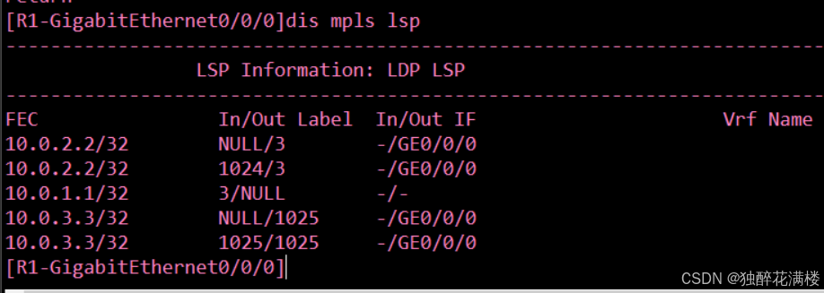 可以看到,MPLS 网络已经为R1,R2和R3的Loopback接口路由建立了相应的LSP。