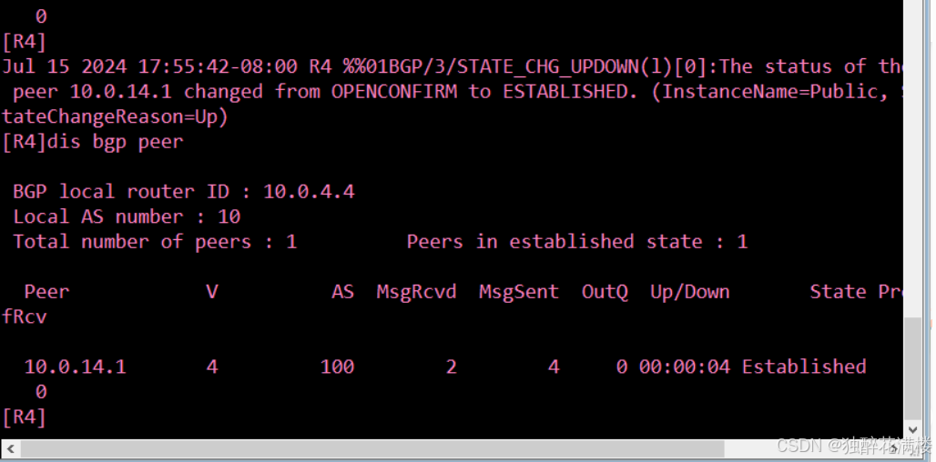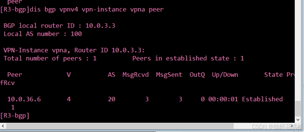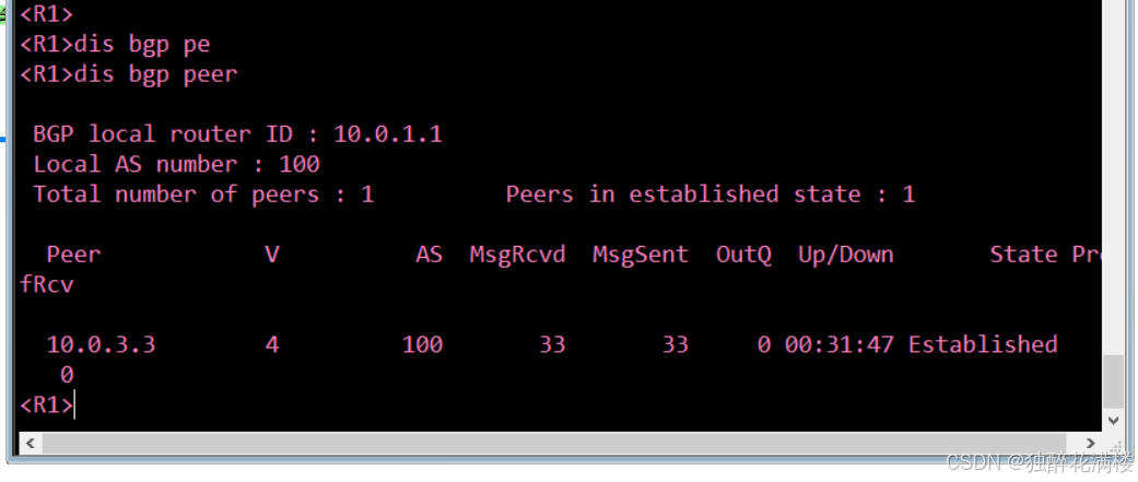 可以看到,R1与R3之间的 BGP 邻居状态为Established,表明BGP邻居关系已成功建立。