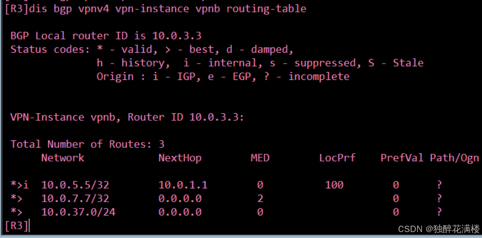 可以看到,R3的 BGP路由表中不但拥有10.0.5.5/32和10.0.7.7/32的路由信息,而且还拥有10.0.37.0/24的路由信息。与使用BGP协议或静态路由方式来提供PE-CE连通性不同,使用OSPF协议实现PE-CE的连通时,PE与CE之间的链路在引入路由时也会被引入进BGP。如果需要避免这种情况,需要在将OSPF 路由引入BGP时进行过滤,举例如下。