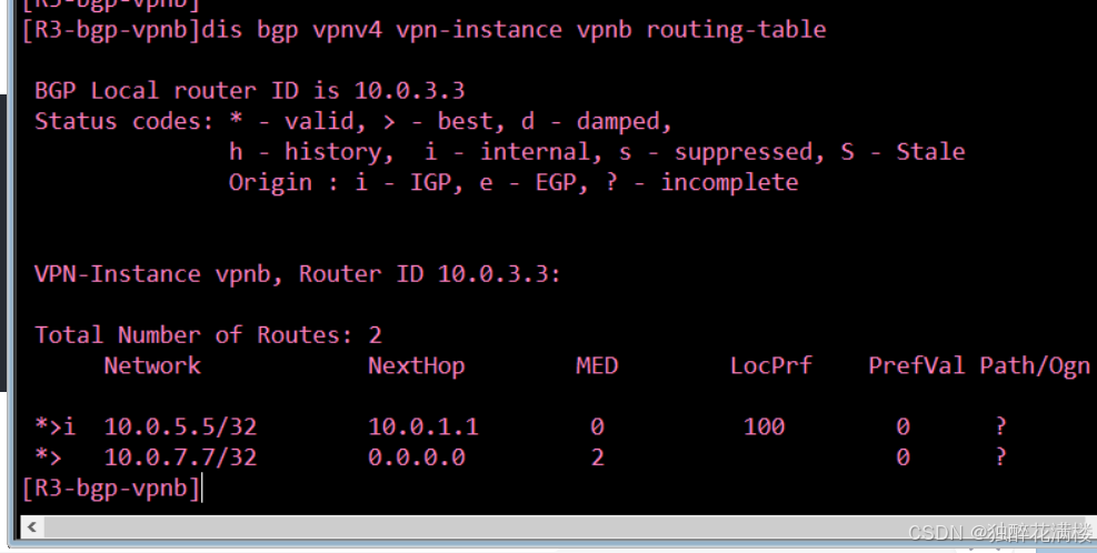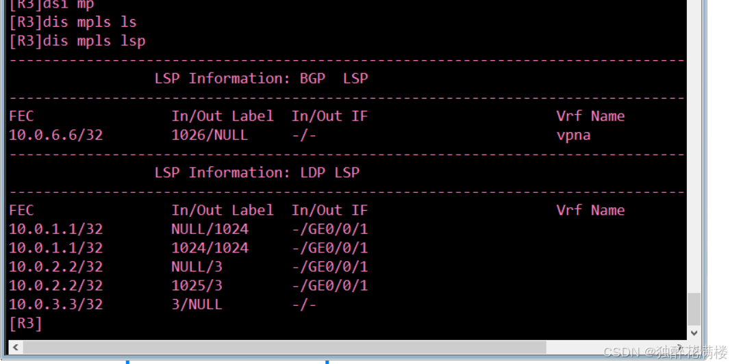可以看到,表中出现了BGP LSP的信息,FEC为10.0.4.4/32,In标签为1026,Out标签为NULL,VRF Name为vpna。In标签1026应该是由MP-BGP协议分配的内层标签,仅用于区分路由信息所属的VRF。
