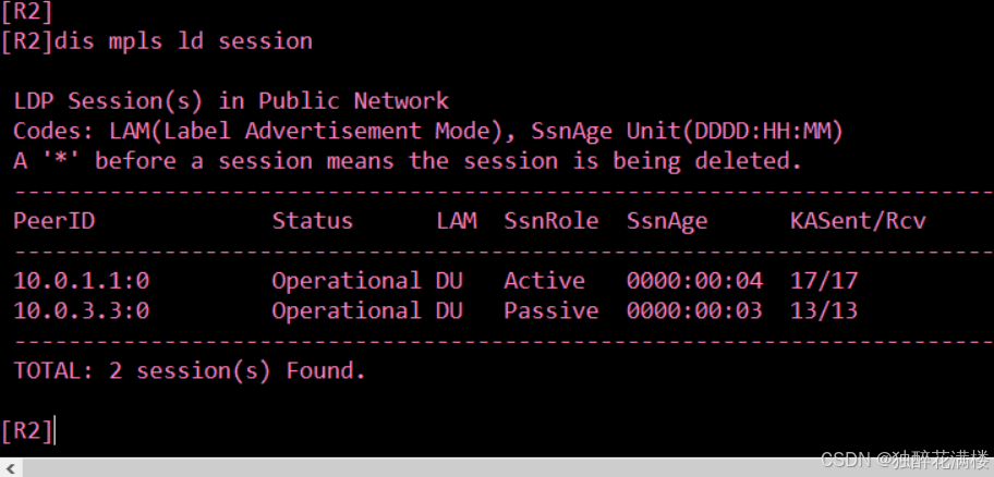可以看到,LDP会话状态为Operational,会话成功建立。