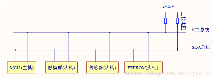 - 一个 IIC 总线只使用两条总线线路,一条双向串行数据线(SDA),一条串行时钟线(SCL)。数据线用来表示数据,时钟线用来数据收发同步。