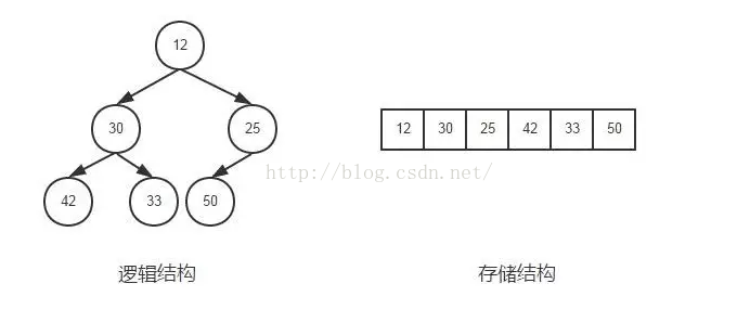 一般都是数组来存储堆,i结点的父结点下标就为(i – 1) / 2。它的左右子结点下标分别为2 * i + 1和2 * i + 2。如第0个结点左右子结点下标分别为1和2。存储结构如图所示: