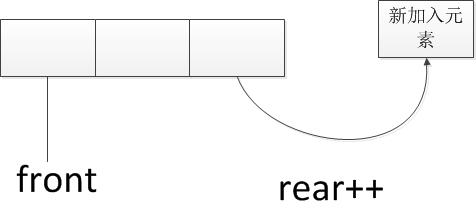 用数组实现链表时,需要预先分配数组的大小,用front和rear下标分别表示队头元素下标和队尾元素下标,插入一个元素时,使队尾的下标rear加1,删除一个元素时,front下标加1,判断是否为空的队列只要判断front和rear是否相等。队列的插入操作可表示为