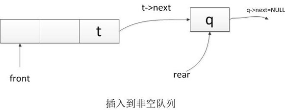 用链表实现队列,需要定义节点结构体存储节点的值和指针,另外还要定义头指针和尾指针,分别指向队头和队尾,插入元素的操作可以表示为