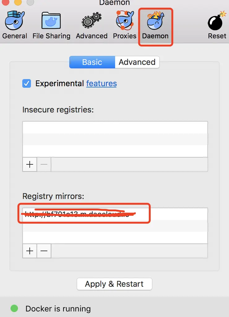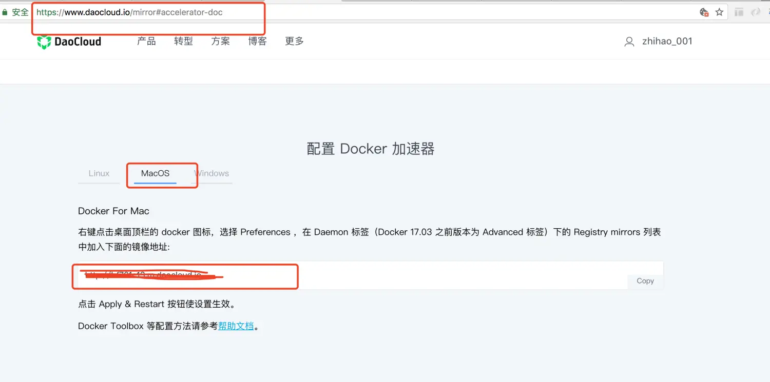 注册 daocloud,然后在 mac 标签页复制加速器 url。