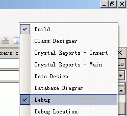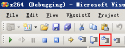 我以前多次说过,读代码首先要读框架(即粗读),任务是大致搞清楚各个函数在干什么。那么 x264_param_default 是我们第一个遇到的函数,它的功能是什么呢?顾名思义,猜测肯定是进行一些参数的设置了,因为 param 就是英文单词 parammeter 啊,按 F11 进到函数里浏览一下,果然是对一些变量赋值的操作,那么多变量啥意思?现在不必管那么多,因为你现在的任务只是搞清楚各个函数的功能,不要跑题了。 x264_param_default 里的第一个函数是 memset,这个是系统函 数,你要问啥功能?去查 MSDN;第二个函数是 x264_cpu_detect,啥功能?再顾名思义,因为 X264 针对不同的平台做了优化,这个肯定是用来检测你所使用的平台的,我就不进去看了。好了,直接点 debug 工具栏上的 step out(见下面第一个截图)返回 main 函数。你在你的 VC 里没有看到 debug 工具栏?那好吧,在 VC 工具栏的空白地方点鼠标右键,选中 debug(见下面第二个截图)。