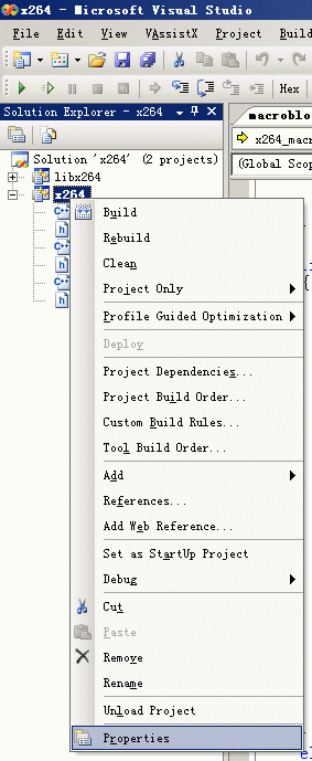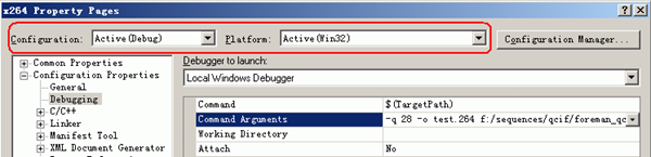首先肯定是要把 X264 编译通过了,这个我就不多说了,论坛帖子 VS2008下最新X264(svn 2009.9)编译不过的解决办法(附编译通过+修改内存泄露版本) 里讲得很清楚。编译通过之后第一步就是设置编码参 数,一开始尽量从最基本的学起,因此采用最简单的选项,我的参数是:-q 28 -o test.264 f:/sequences/qcif/foreman_qcif.yuv 176x144 --no-asm,在哪里设置呢?看下面的截图(在第一个图中选择 properties 后就会出现第二个图了)。至于各个参数的意义嘛,看一看 X264 的帮助信息(x264.c 里面的 Help 函数),这里说说我用的这些参数的意思。-q 28 指定采用固定 QP = 28 进行编码,-o test.264 指定输出的码流文件名为 test.264,f:/sequences/qcif/foreman_qcif.yuv 这个当然是指定原始待编码图像序列了,176x144 指定待编码图像的宽高,--no-asm 指定不采用汇编优化,全 C 代码才方便我们跟踪噻。对了,差点忘记了,要调试运行还要设置一下下面第二个截图的红色框内的内容。