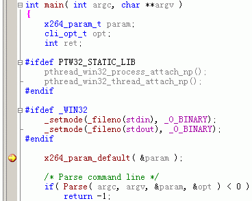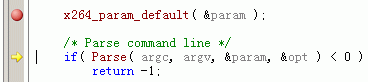 好了,配置完了就要开始调试运行了哦。在 x264.c 文件中找到 main 函数,在 x264_param_default 函数所在这一行上下断点(即把光标移到这一行,然后按 F9),然后调试运行编码器(即按 F5),程序就会停在断点处(如下面截图)。下面开始单步调试了,除了我提到的东西,其他都不需要关心。