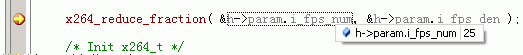 好了,继续 F10(注意:x264_cqm_parse_file 这个函数是停不住的,它的功能顾名思义是解析量化矩阵配置文件,我们的编码选项里没有采用量化矩阵,因此它是不会被执行到的,你说我咋顾名思义知道它是跟 量化矩阵相关的,因为 cqm 就是 custom quant matrix,你再要问我咋知道 cqm 是 custom quant matrix,我猜的,真是猜的!),到 x264_reduce_fraction 函数,这回我顾名思义不出来它在干什么了,那就 F11 进去,看见一小段计算,也不知道在干什么。但是再看看 x264_reduce_fraction 的输入参数,i_fps_num,顾名思义是帧率,此时把鼠标移动到这个变量上显示它的值是 25,见下面截图(要想知道它在哪里被赋值的,回头去找噻,还记得我们在 main 里遇到的第一个函数是 x264_param_default 么,当时顾名思义它的功能是什么?如果你回去找了,你会发现里面有个语句是:param->i_fps_num = 25;那到底是不是它呢?很简单,把这里 25 改成其他值,例如 27,再重新调试执行到 x264_reduce_fraction,看 h->param.i_fps_num 是否等于 27 就知道了。)
